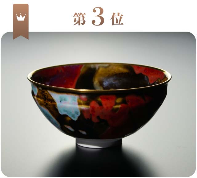 美術史に名を刻む天才陶芸家の一点物黎明の海辺を表現した作品。轆轤目により、打ち寄せる波を表現し、辰砂釉(銅釉秘伝)により、朝日の光を表現する。無上の価値が置かれる芸術品。
