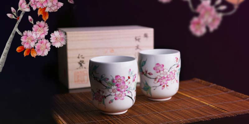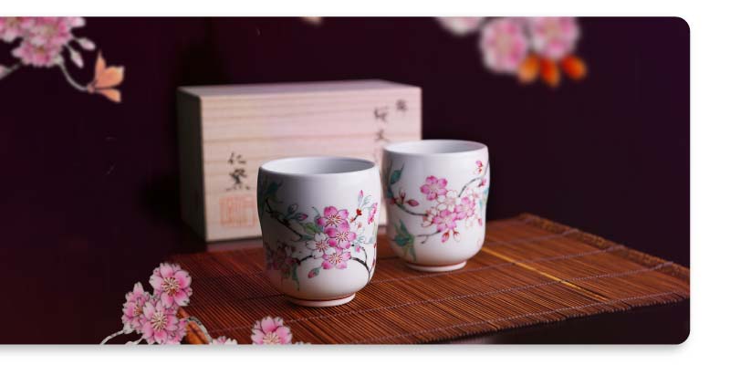 天皇皇后陛下への御献上の誉れを預かった当店人気の高級夫婦湯呑でございます。乳白色の磁器肌に色鮮やかな桜が咲き誇っており、余白の美を心ゆくまでご堪能いただける格別の逸品でございます。