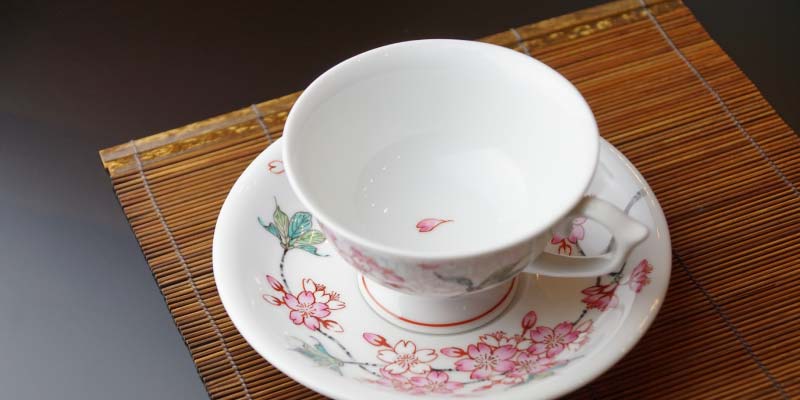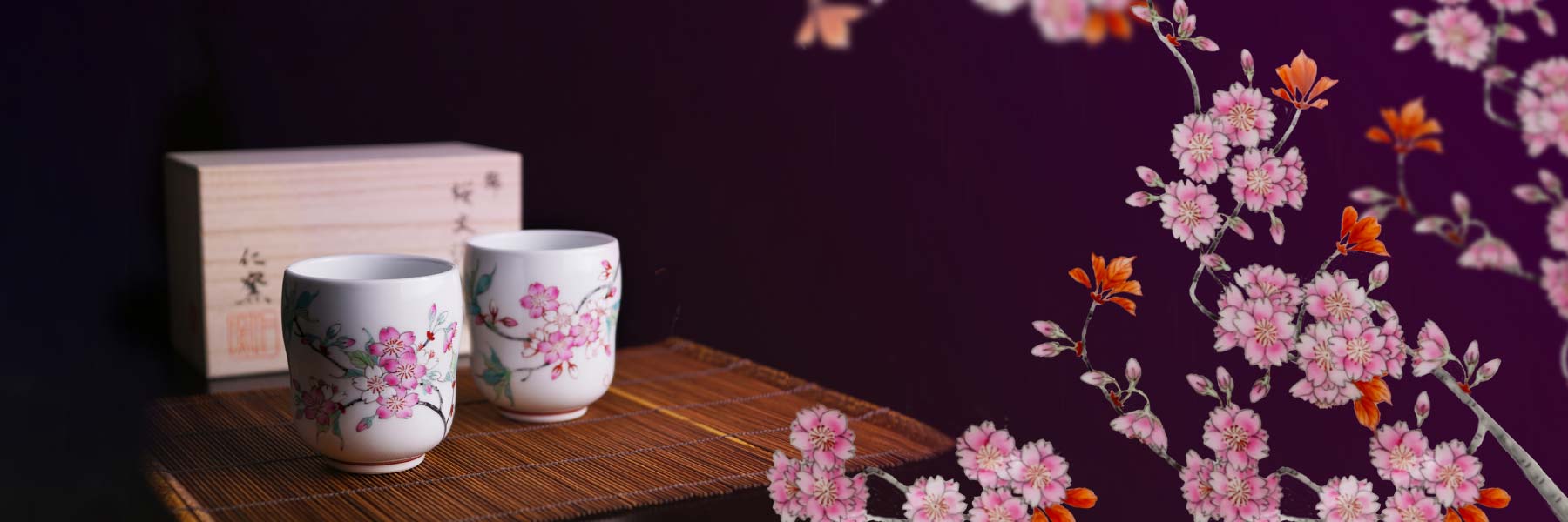 天皇皇后陛下への御献上の誉れを預かった当店人気の高級夫婦湯呑でございます。乳白色の磁器肌に色鮮やかな桜が咲き誇っており、余白の美を心ゆくまでご堪能いただける格別の逸品でございます。