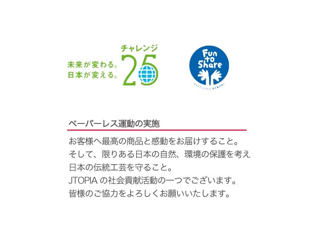 JTOPIAではギフトでのご注文を数多く頂いていること、並びに、環境保護活動の一環で積極的に「ペーパーレス運動」を実施しております。そのため、お届けする商品の中には、商品の領収書や納品書など、金額のわかるものは同封しておりません。ご希望の場合にはお気軽にお申し付けくださいませ。
