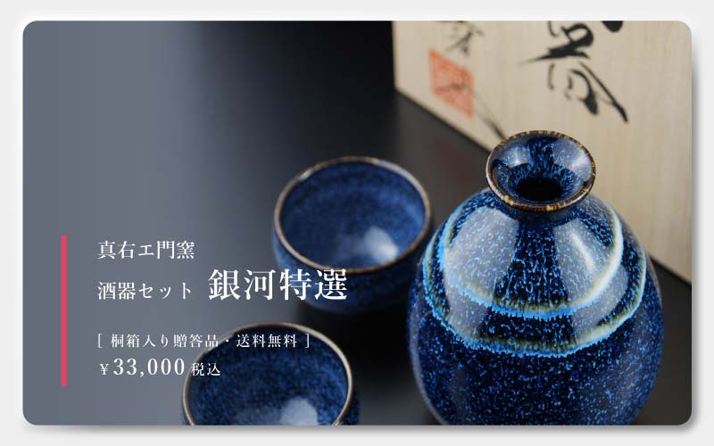 ずっと触っていたくなるような、なだらかな弧を描いた曲線美。星が降り注ぐ青の釉薬に、銀河の流星を表した一筋の窯変。神秘に満ちた酒器セット。