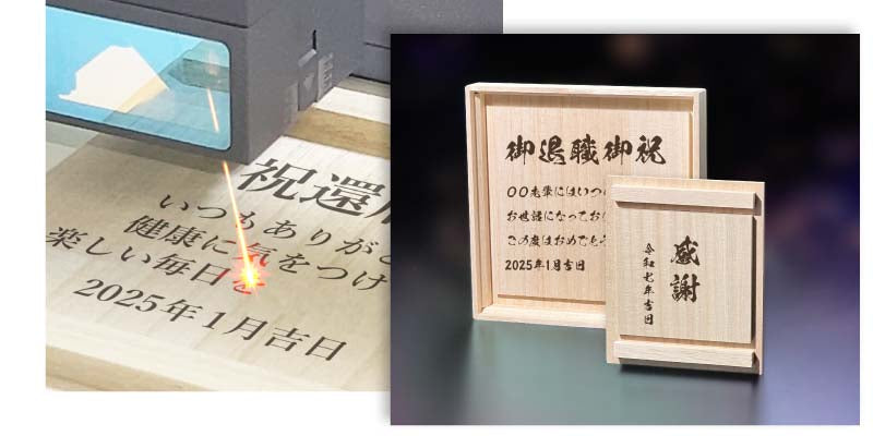レーザーで木箱の蓋裏へメッセージを刻印します。50文字までの刻印が可能で、ご要望の多かった大数量文字の刻印に対応しています。
