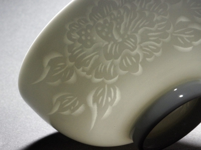 経済産業省指定の伝統工芸士であり、日本工芸会正会員として著名な山口幹彦。精緻さと存在感を併せ持った独自の白磁牡丹彫。氏の名工としての人生は朝日新聞社を筆頭に大手新聞社から特集を組まれるほどです。造形の名匠による力作。凛とした白が映える高級茶碗です。