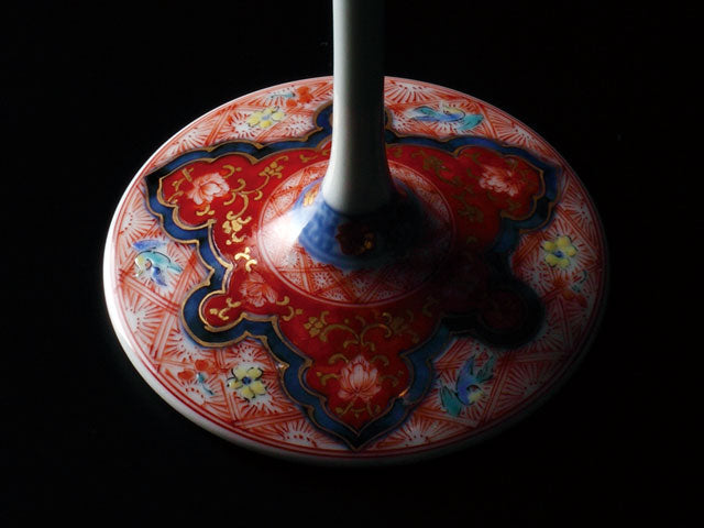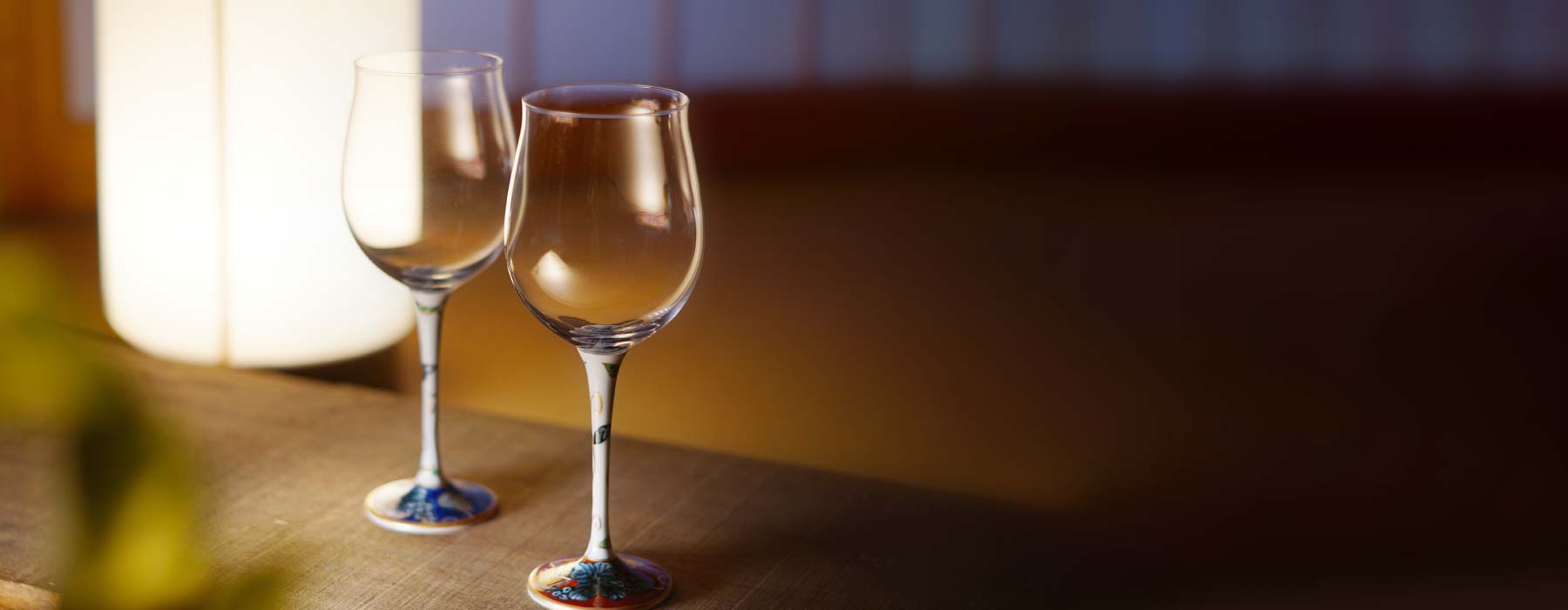 「有田浪漫グラス」は別名セランドグラスとも言われ、ガラスの持つ透明性と有田焼の美しさの互いの持ち味が結びつき、艶やかな色彩とまばゆい金彩が印象的なワイングラスです。400年の伝統を持つ有田焼の格式ある窯元との響宴をどうぞお楽しみ下さい。