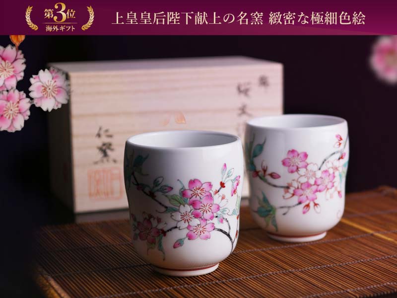 定年退職祝いや会社社長・役人の退任祝いなど特別の贈答品に好評をいただいている格式ある夫婦湯呑です。余白に繊細な色絵を際立たせる有田焼柿右衛門様式の美。天皇皇后両陛下へ作品を献上した全国屈指の名窯仁窯当主小畑裕司氏、渾身の力作です。